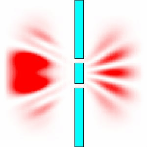 Se fosse uma ‘partícula clássica’, ela teria ricocheteado na parede e nada seria visto do outro lado ou ela teria atravessado um dos orifícios (caso fosse menor que eles). No caso de uma partícula quântica, há interferência de sua onda de probabilidade, e a partícula pode ser encontrada do outro lado. (De acordo com Fernandez Palop, 2009)